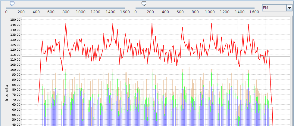 Pro zadané souřadnice, vysílače a parametry je vyhodnocena intenzita signálu. Výsledky jsou zobrazeny v tabulce a sloupcovém diagramu. Je-li požadováno, vyhodnotí se statistiky přes všechny zadané body.