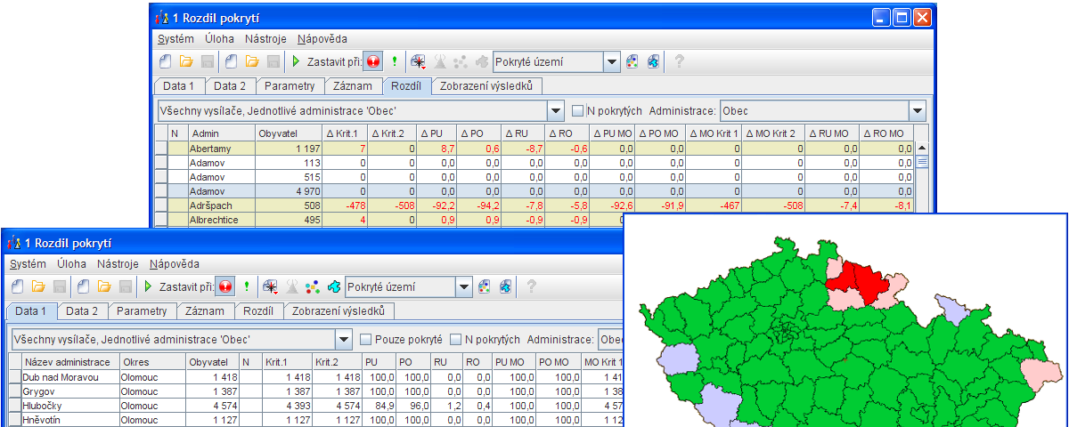 Vstupem pro výpočet jsou soubory uložených výsledků ze systému Vyhodnocení pokrytí. Výsledky poskytují informace o změně pokrytí z hlediska pokryté plochy administrativních celků a/nebo počtu pokrytých obyvatel. Výsledky jsou k dispozici v tabelární podobě – tabulka rozdílů jednotlivých ukazatelů pokrytí (pokrytí plochy, pokrytí obyvatel) a v grafické podobě zobrazené v mapovém systému. S použitím diferenčních barevných stupnic lze jednoduše barevně klasifikovat shodu a několik kategorií nárustu a poklesu percentuálních ukazatelů pokrytí.